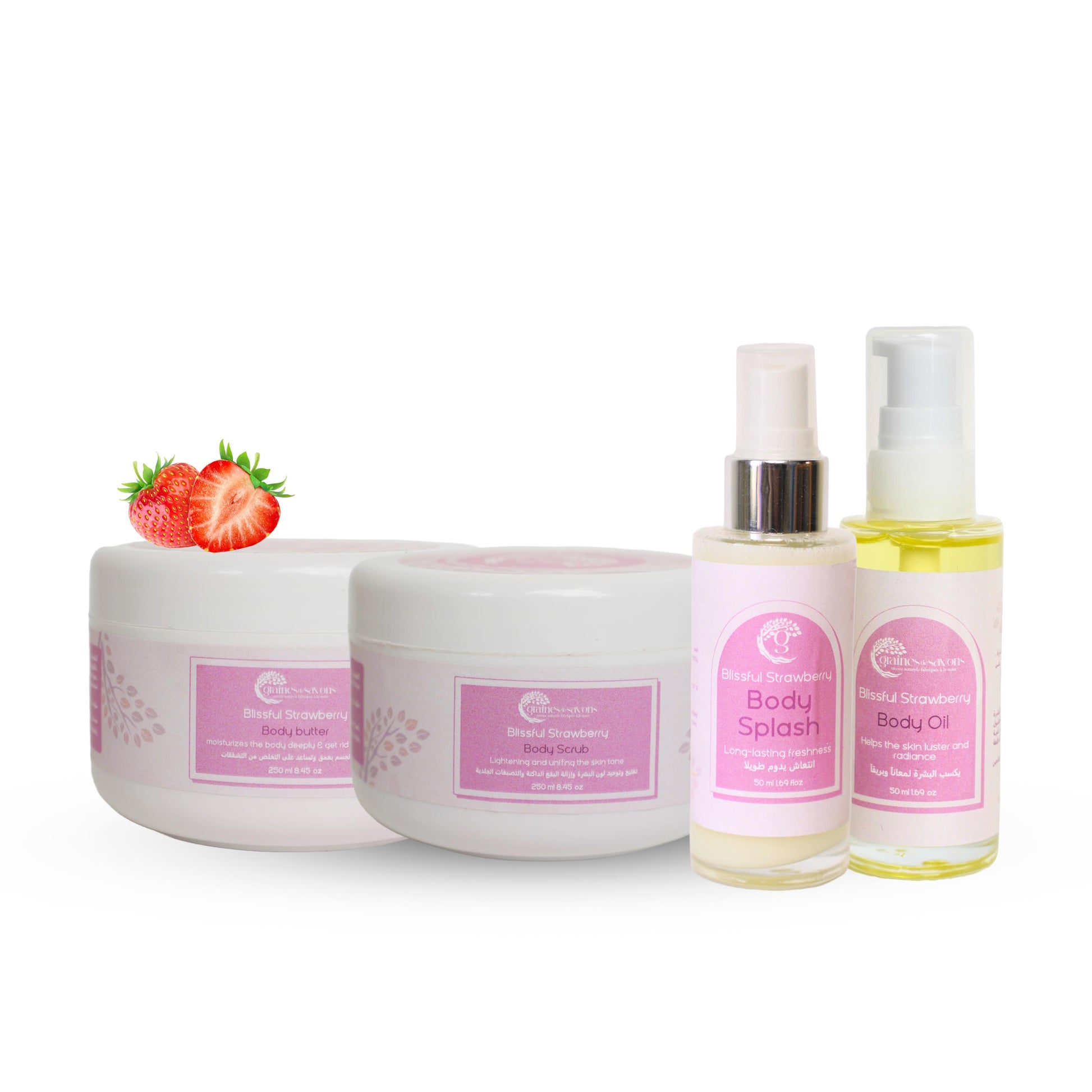 استمتعي بالنكهة الحلوة والفواكه لمجموعة العناية بالجسم بالفراولة، المصنوعة من مكونات عضوية وطبيعية 100% 🌿💖. تم تصميم هذه المجموعة المغذية لترطيب بشرتك وتنشيطها وتغليفها برائحة التوت المبهجة.